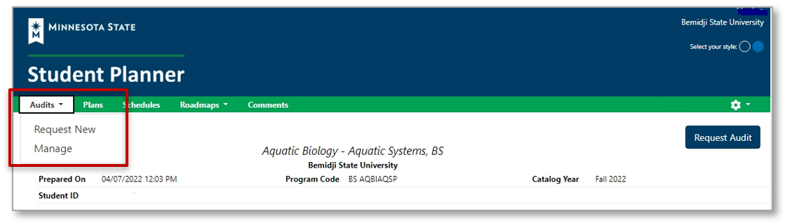 After logging into Minnesota State Student Planner, you will be on the Request an Audit page. If you have records at more than one school within Minnesota State, you will be prompted to first select the school for which you want to run an audit.