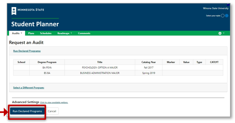 - Select Run Declared Programs to generate an audit of the program(s) or major(s) you have declared at your school and a Minnesota Transfer Curriculum (MnTC) audit.