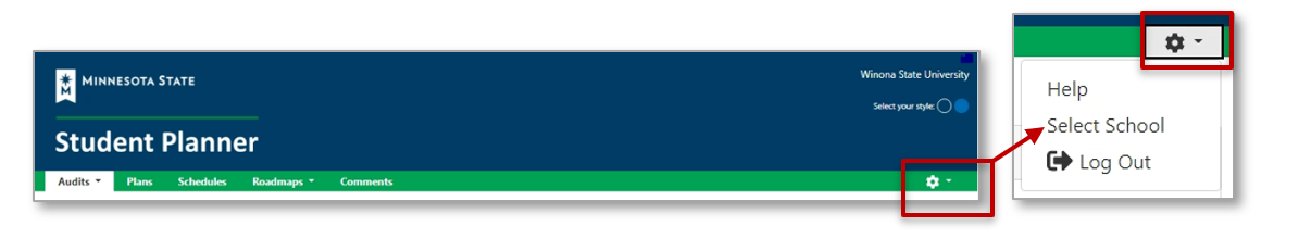 If you have records at more than one school within Minnesota State, you can choose your next school from any screen in the Minnesota State Student Planner by selecting the settings gear, and then Select School.
