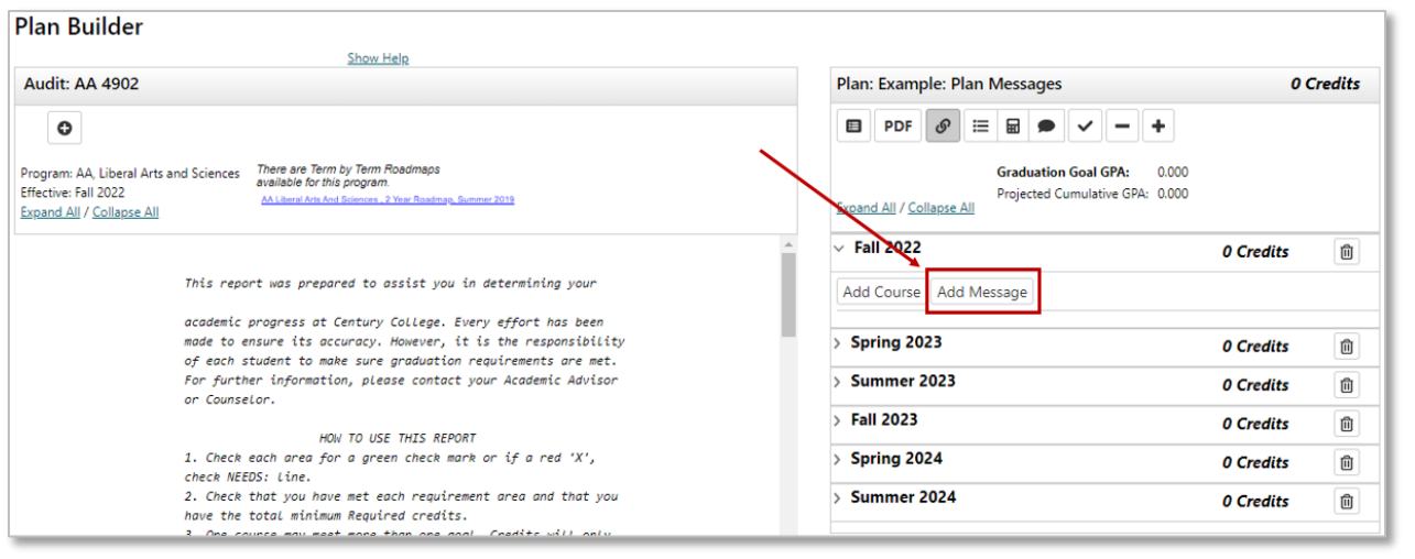 There are preconfigured messages that can be added to a tern on a plan in Graduation Planner. Plan Messages are important notes that can be added to a term on a plan to remind you of tasks.