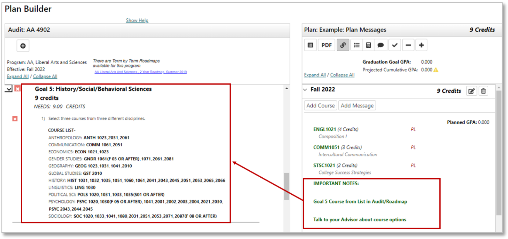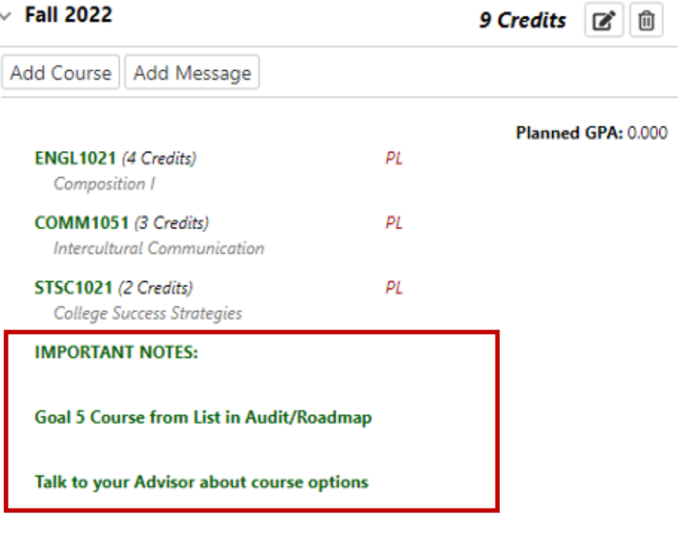 Rather than selecting a course, they added these messages as a placeholder to remind them to select a Goal 5 course when they return to planning that term.